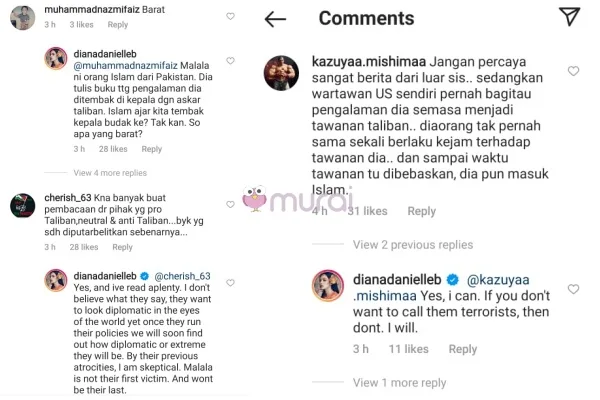 Perkongsiannya itu menarik perhatian warganet terhadap pandangan yang disuarakan oleh aktres tersebut, rata-rata ramai yang tidak menyetujui pandangan Diana Danielle terhadap Taliban.