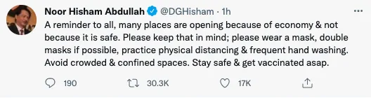 “Peringatan untuk semua, banyak tempat dibuka kerana ekonomi & bukan kerana sudah selamat. Perlu diingatkan untuk pakai pelitup muka, atau pakai 2 lapis jika boleh, amalkan jarak fizikal & kerap mencuci tangan. Elakkan ruang yang sesak & terkurung. Tetap selamat & dapatkan vaksin secepat mungkin.”- tulis Dr Noor Hisham di laman twitternya.