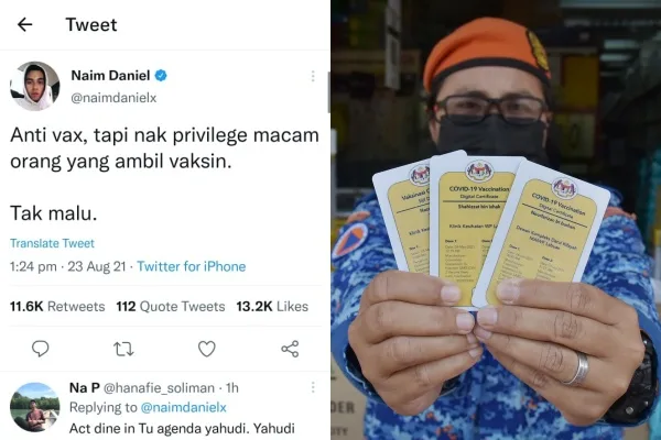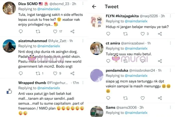 Tweet milik Naim Daniel itu menarik perhatian ramai wargamaya, dan rata-rata meluahkan rasa tidak puas hati terhadap golongan anti vaksin yang mahu menggunakan sijil digital golongan vaksinasi untuk kegunaan peribadi mereka.