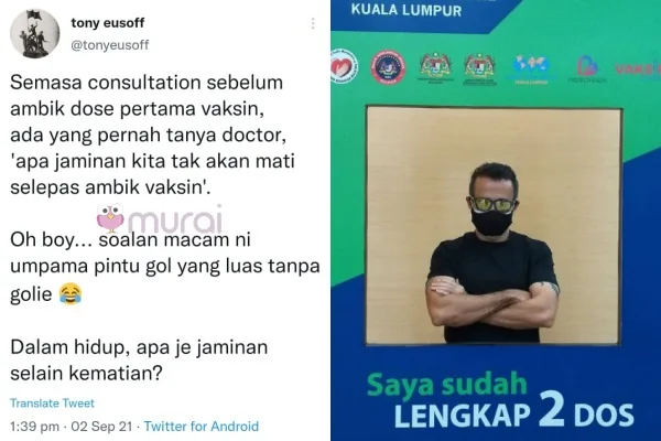Dipetik dari laman Twitter aktor veteran tersebut Tony menyatakan sewaktu mendengar konsultasi sebelum mengambil vaksin, aktor tersebut mendengar ada yang bertanya kepada doktor mengenai jaminan mengambil vaksin.