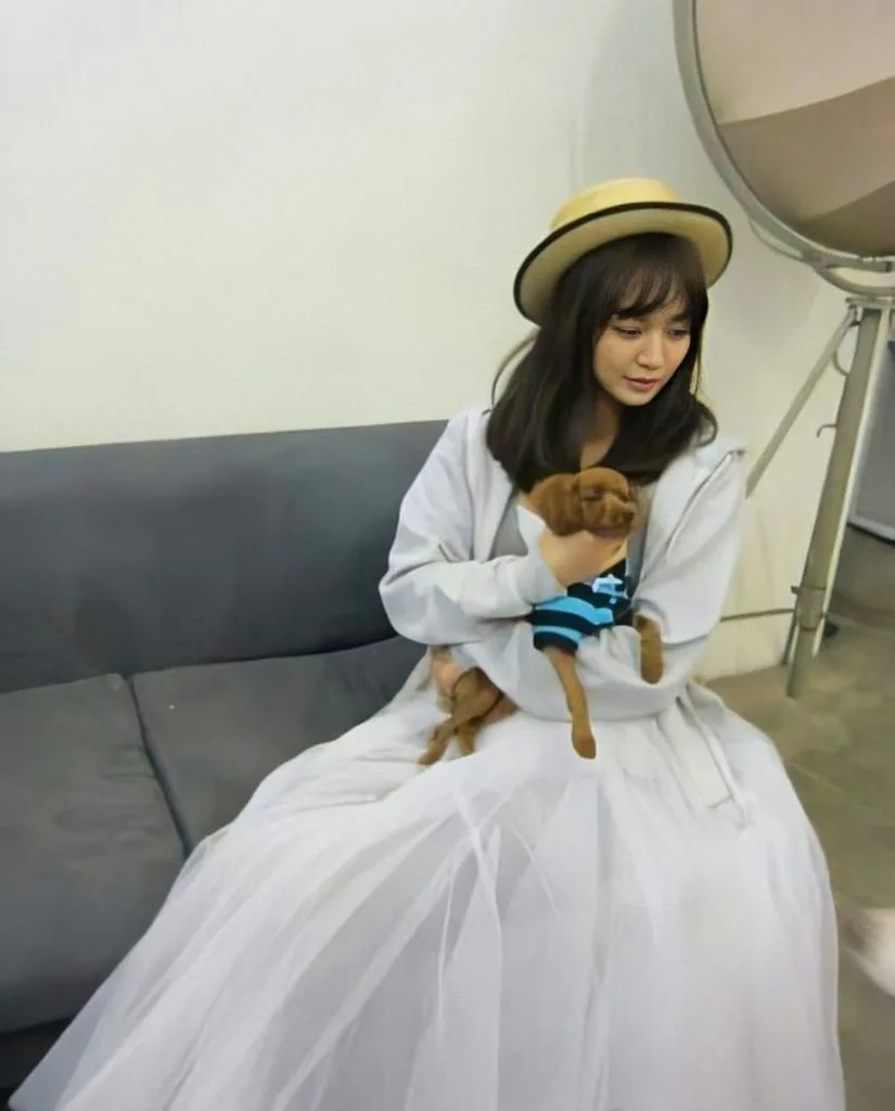 Shin Min Ah kelihatan begitu cantik sambil memegang anjing kesayangannya. Dengan baju panas berwarna putih yang dipadankan dengan skirt kembang berwarna sepadan. Seperti biasa, aksesori wajib bagi menyerlahkan lagi penampilannya adalah topi. Anjing kesayangannya itu diberi nama Woodi oleh Shin Min Ah. Bintang drama ‘Oh My Venus’ ini sering membawa anjing peliharaannya itu ke lokasi.