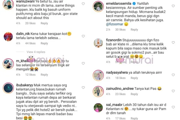 “Ya betul tu… Isu air Kelantan ni macam dah lama.. Perkara sama berlaku… Kalau balik kampung basuh uniform putih, memang habis baju jadi buruk.. Kerajaan patut ambil tindakan terhadap perkara ini.”