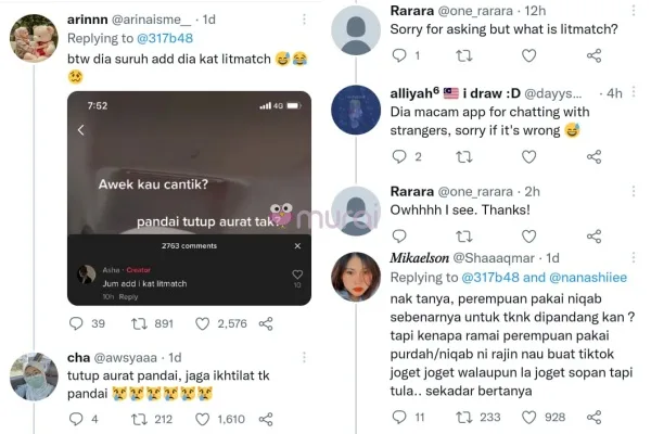 Melihat cara wanita berpurdah dalam video TikTok menyentuh isu aurat, wargamaya memperli wanita tersebut dengan mengatakan dirinya sendiri tidak menjaga ikhtilat dan mengajak orang ramai jadi kenalannya di aplikasi Litmatch.