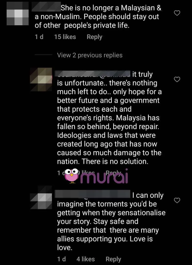 “Dia bukan muslim. Dan itu adalah kehidupannya mengapa anda terlalu obses aibkan dan viralkan seseorang?Biarkan dia dengan kehidupannya. Dia sedang gembira. Kita sudah ada banyak kes di Malaysia ini yang puak-puak penunggang agama yang korang sokong itu buat kesan terhadap orang lain dan negara. Selesaikan itu” ujar mereka