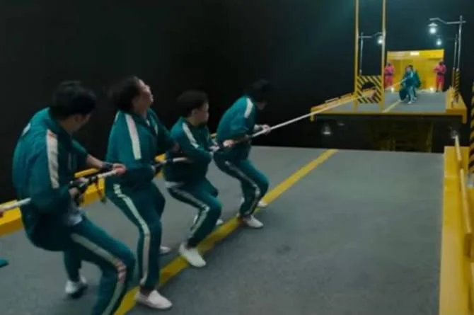 Kedengaran seperti permainan yang mudah bukan? Hanya tarik tali, namun di dalam “Squid Game’ ianya adalah permainan pertaruhan nyawa yang sangat mencabar. Bendera akan diletakkan di tengah garisan bagi mengetahui pasukan yang menang. Pemain perlu mengalahkan musuh dengan menarik tali sekuat yang mungkin di atas jambatan yang sangat tinggi. Pasukan yang jatuh akan dikira kalah dan mereka akan mati.