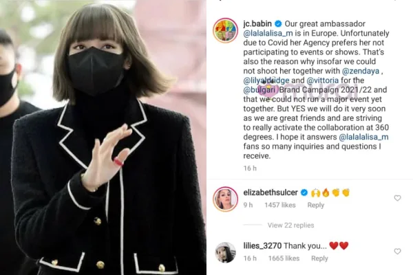 “Duta besar kami @lalalalisa berada di Eropah, Malangnya kerana Covid, agensi dia lebih suka dia tidak menyertai majlis atau pertunjukan. Itulah sebab mengapa setakat ini kami tidak dapat merakam dia bersama @zendaya, @lilyaldrigde dan @vittoria untuk kempen @bulgari 2021/22.” Jelas CEO Bvlgari