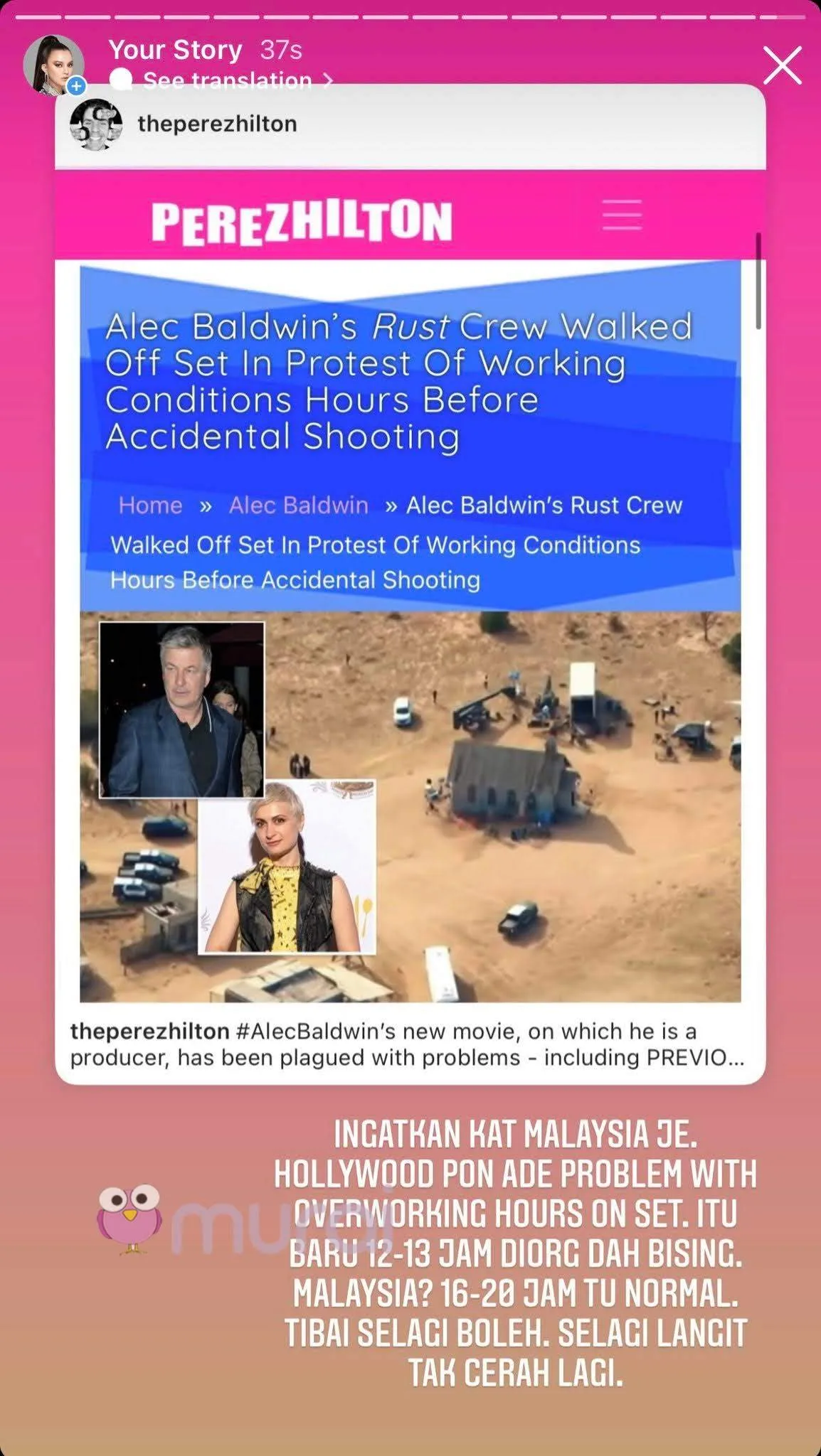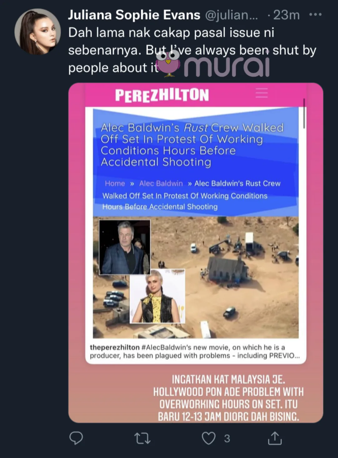 “Ingatkan kat Malaysia je. Hollywood pun ada masalah dengan overworking hours on set. Itu baru 12-13 jam diorang dah bising. Malaysia??