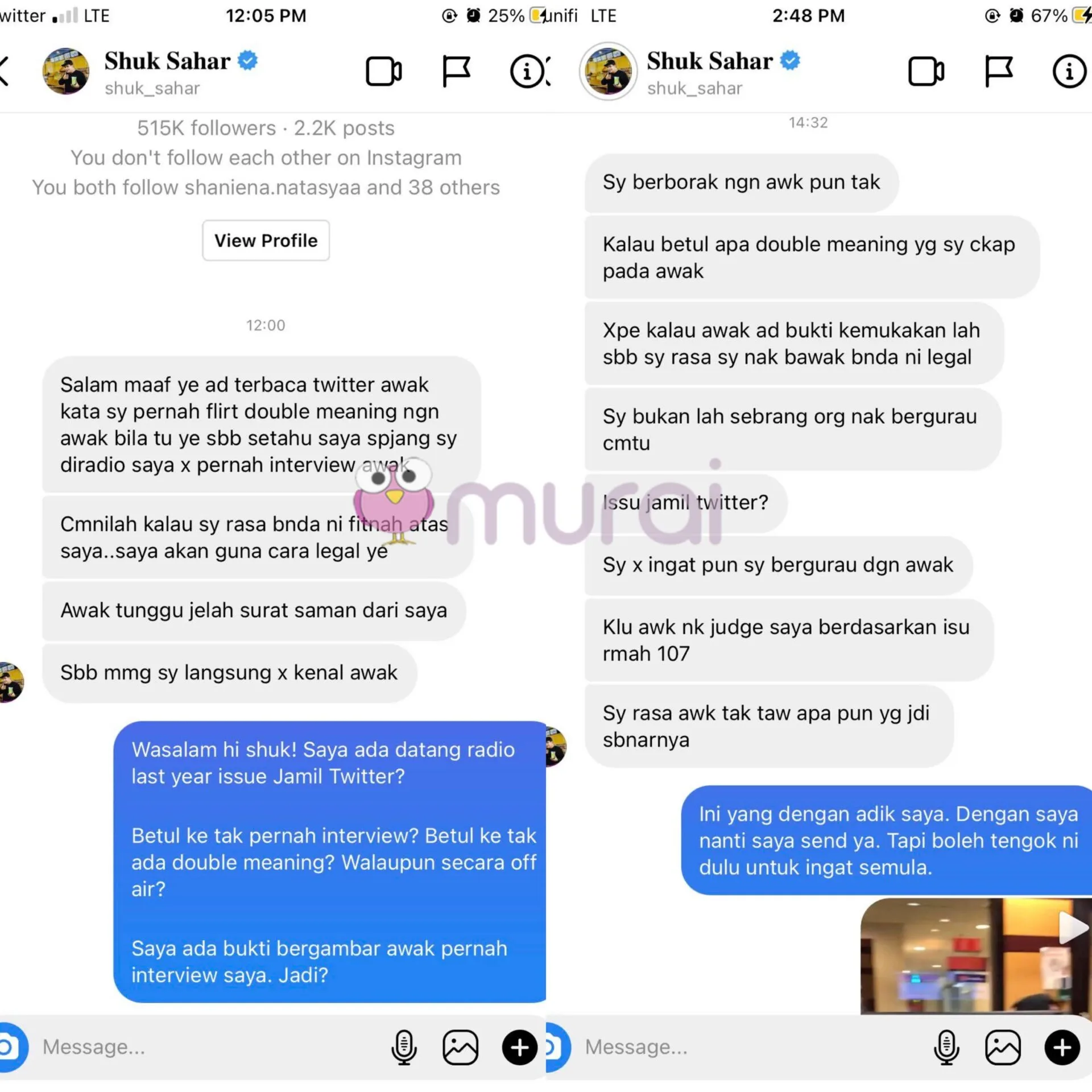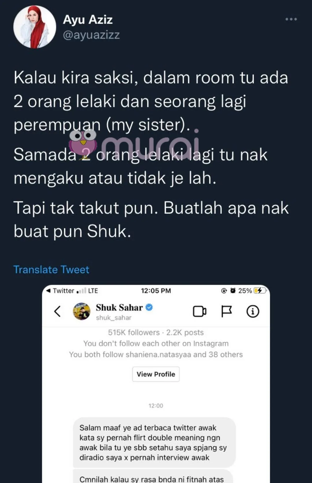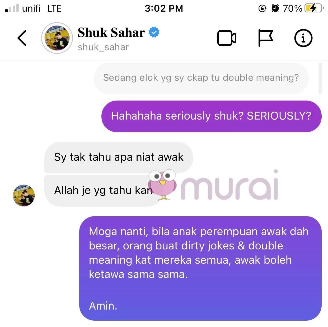 Menerusi laman Twitter, wanita yang dikenali sebagai Ayu Aziz telah memuatnaik perbualannya bersama Shuk Sahar melalui DM (Direct Message). Shuk turut menafikan dakwaan netizen tersebut dan bakal mengambil tindakan undang-undang.
