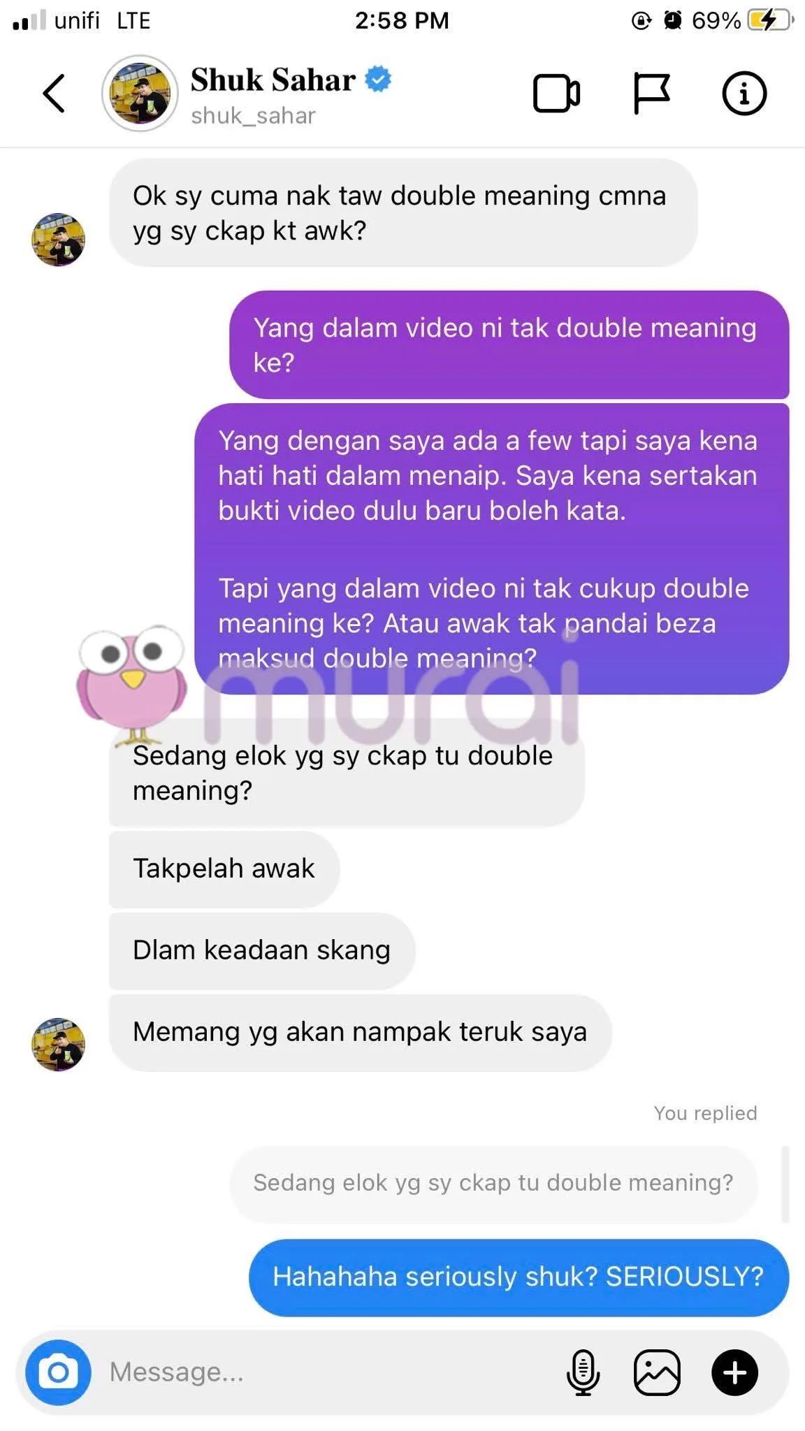 “Salam maaf ye ada terbaca Twitter awak kata saya pernah flirt double meaning dengan awak bila tu ye sebab setahu saya sepanjang saya di radio saya tak pernah interview awak.