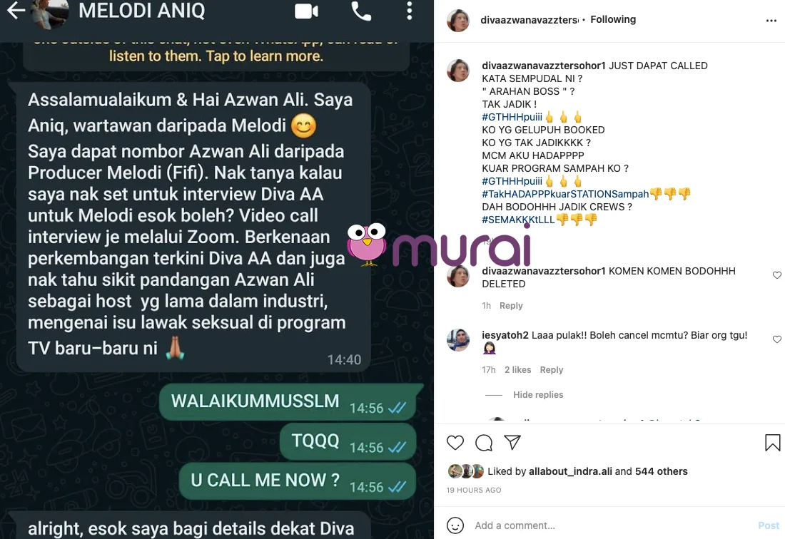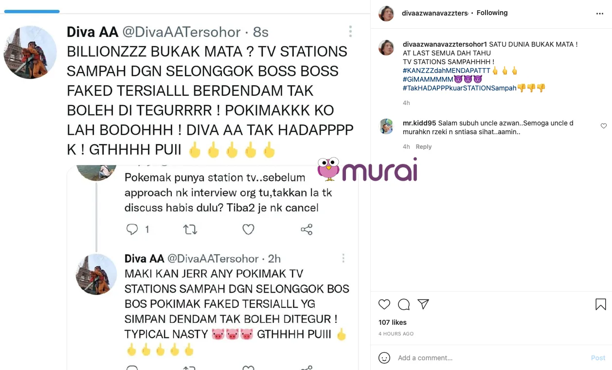 “Aku simpan cerita ini dah setahun ya daripada musim lepas sampaikan musim baru program bodoh itu hari Ahad ini. So aku berdiam diri dan tak dedahkan cerita sebenar. kau tunggu kau ingat kau ada power kau ingat kau bos bos fake ters*al, TV station sampah!