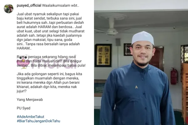 Berdasarkan perkongsian PU Syed di Instagramnya sebentar, warganet tersebut meminta pandangannya mengenai apa hukum kaum Hawa menjual ubat kuat kepada lelaki dengan menggunakan teknik jualan yang agak menarik perhatian mereka.