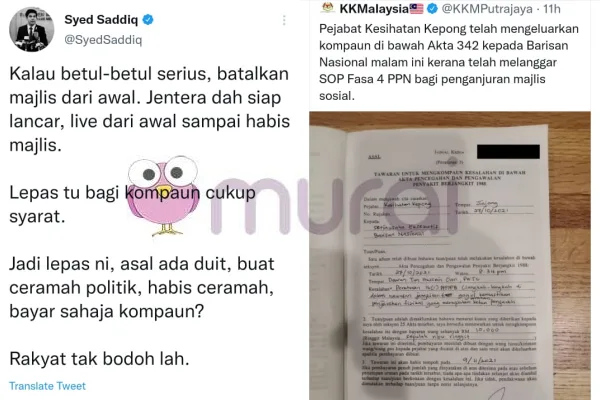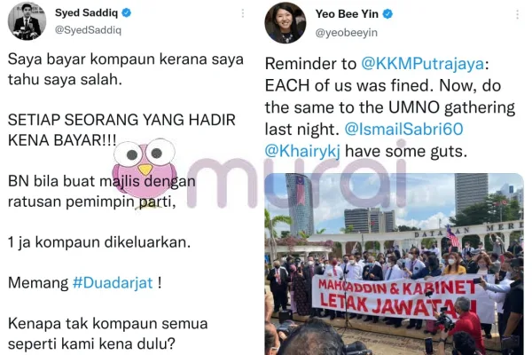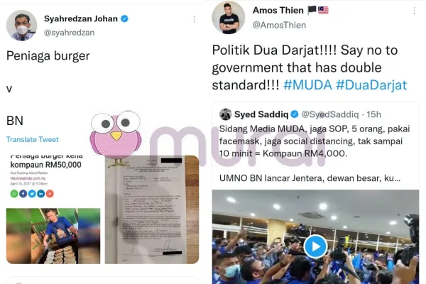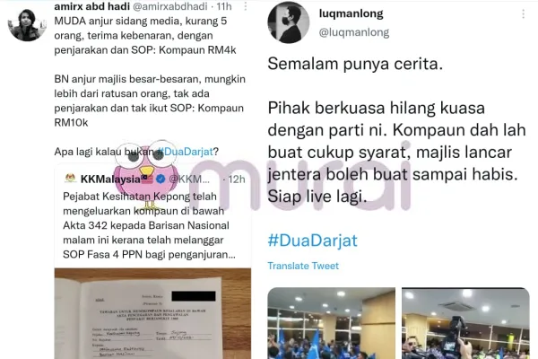 “MUDA anjur sidang media kurang 5 orang, terima kebenaran dengan penjarakan dan SOP. Kompaun : RM4K. BN anjur majlis besar-besaran, mungkin lebih dari ratusan orang, tak ada penjarakan dan tak ikut SOP. Kompaun : RM10K. Apa lagi kalau bukan #Duadarjat ?” Ciap warganet