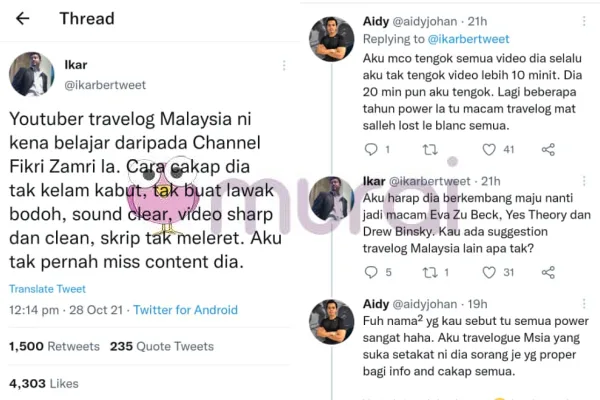 “YouTuber travelog Malaysia ni kena belajar daripada Channel Fikri Zamri lah. Cara cakap dia tak kelam kabut, tak buat lawak bodoh, bunyi jelas, video sharp dan clean, skrip tak meleret. Aku tak pernah miss content dia.” komen pengguna Twitter