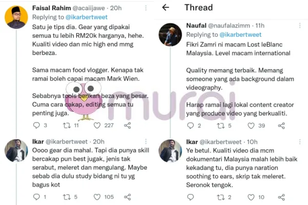 “Satu je tips dia. Gear yang dipakai semua tu lebih RM20K harganya, hehe. Kualiti video dan ‘mic high end’ memang berbeza. Sama macam ‘food vlogger’. Kenapa tak ramai boleh capai macam Mark Wien. Sebab alat berikan beza yang besar. cuma cara cakap, suntingan semua tu penting juga.”