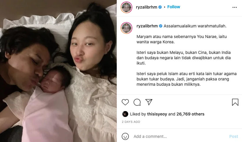 “Assalamualaikum warahmatullah. Maryam atau nama sebenarnya You Narae, iaitu wanita warga Korea. Isteri saya bukan Melayu, bukan Cina, bukan India dan budaya negara lain tidak diwajibkan untuk dia ikuti.