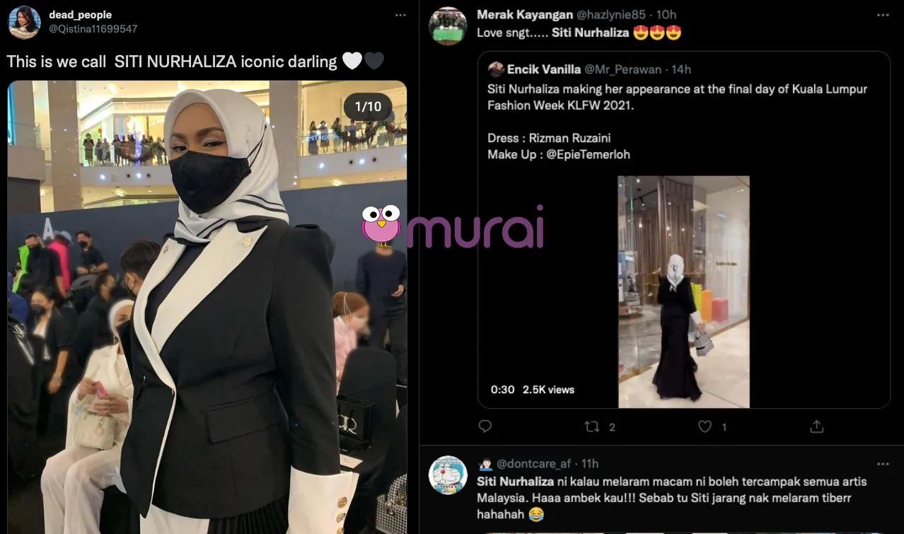 Penampilan penyanyi popular tanah air, Dato Sri Siti Nurhaliza di acara Kuala Lumpur Fashion Week 2021 (KLFW2021) pada Ahad, mencuri perhatian ramai.