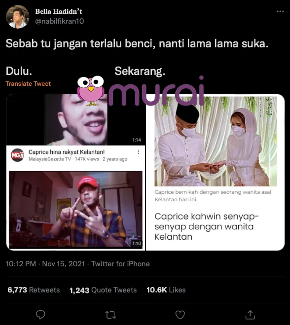 “Sebab itu jangan terlalu benci, nanti lama lama suka” ciapnya sambil berkongsi tangkap layar kenyataan Caprice sebelum ini.
