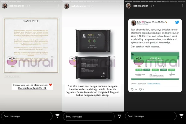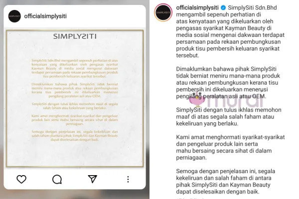 “SimplySiti Sdn. Bhd mengambil sepenuh perhatian di atas kenyataan yang dikeluarkan oleh pengasas syarikat Kayman Beauty di media sosial mengenai dakwaan terdapat persamaan pada rekaan pembungkusan produk tisu pembersih keluaran syarikat tersebut.