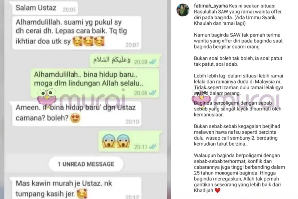 Penulis buku dan penceramah bebas, Ustazah Fatimah Syarha baru-baru ini memuatnaik tangkap layar foto perbualan seorang wanita yang baru bercerai bersama seorang lelaki. Apa yang menarik perhatian orang ramai adalah mengenai kandungan perbualan di dalam mesej tersebut.