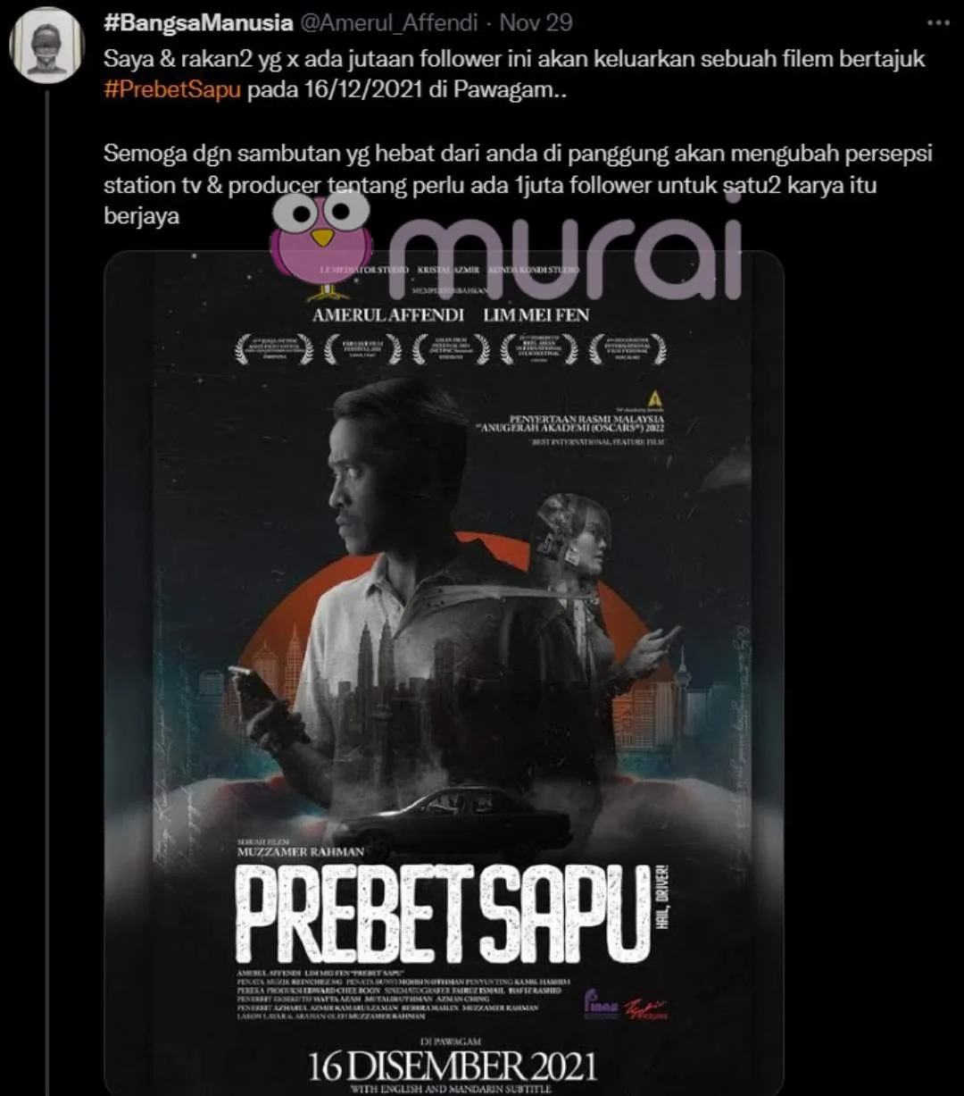 “Saya & rakan-rakan yang tak ada jutaan follower ini akan keluarkan sebuah filem bertajuk #PrebetSapu pada 16/12/2021 di pawagam..