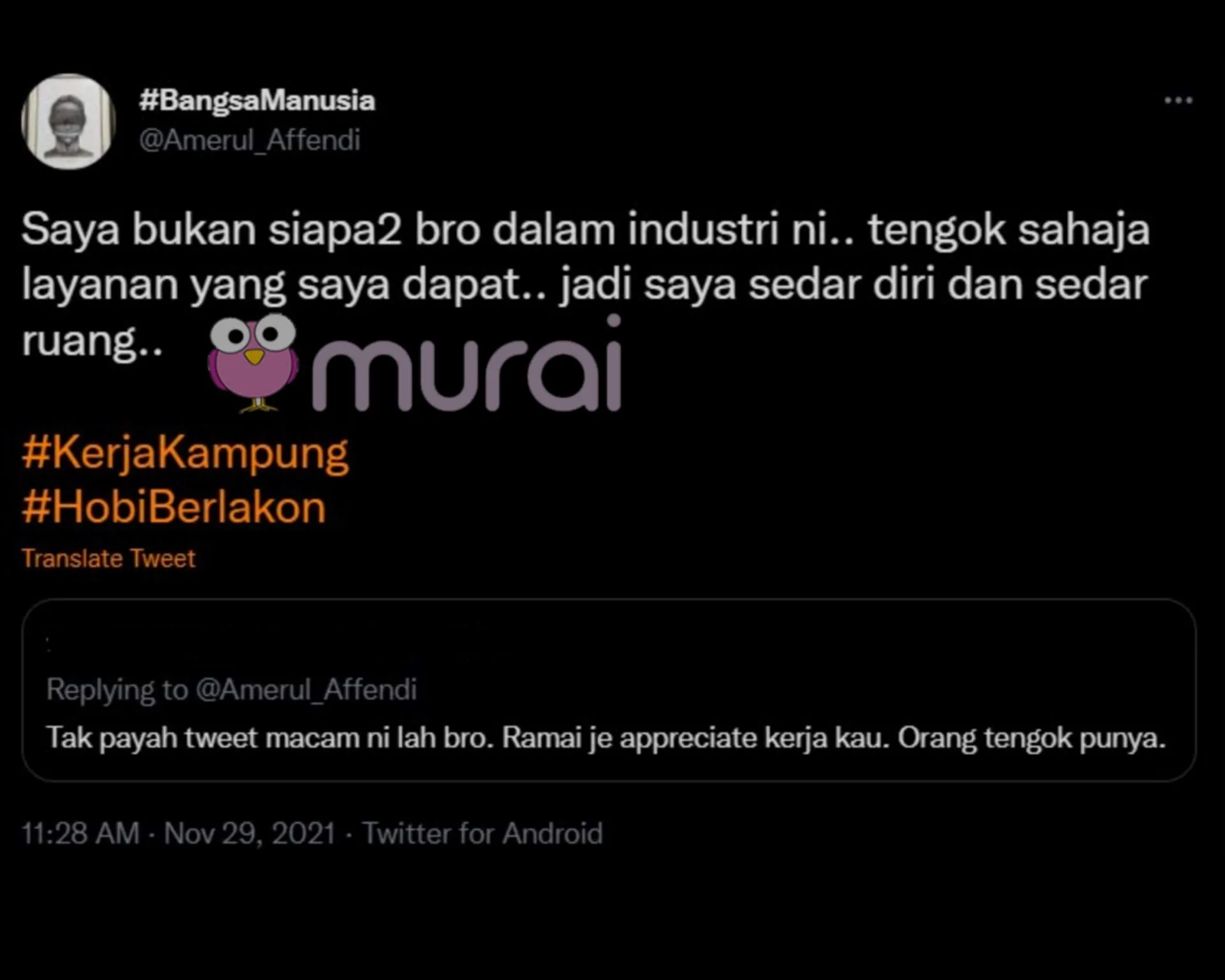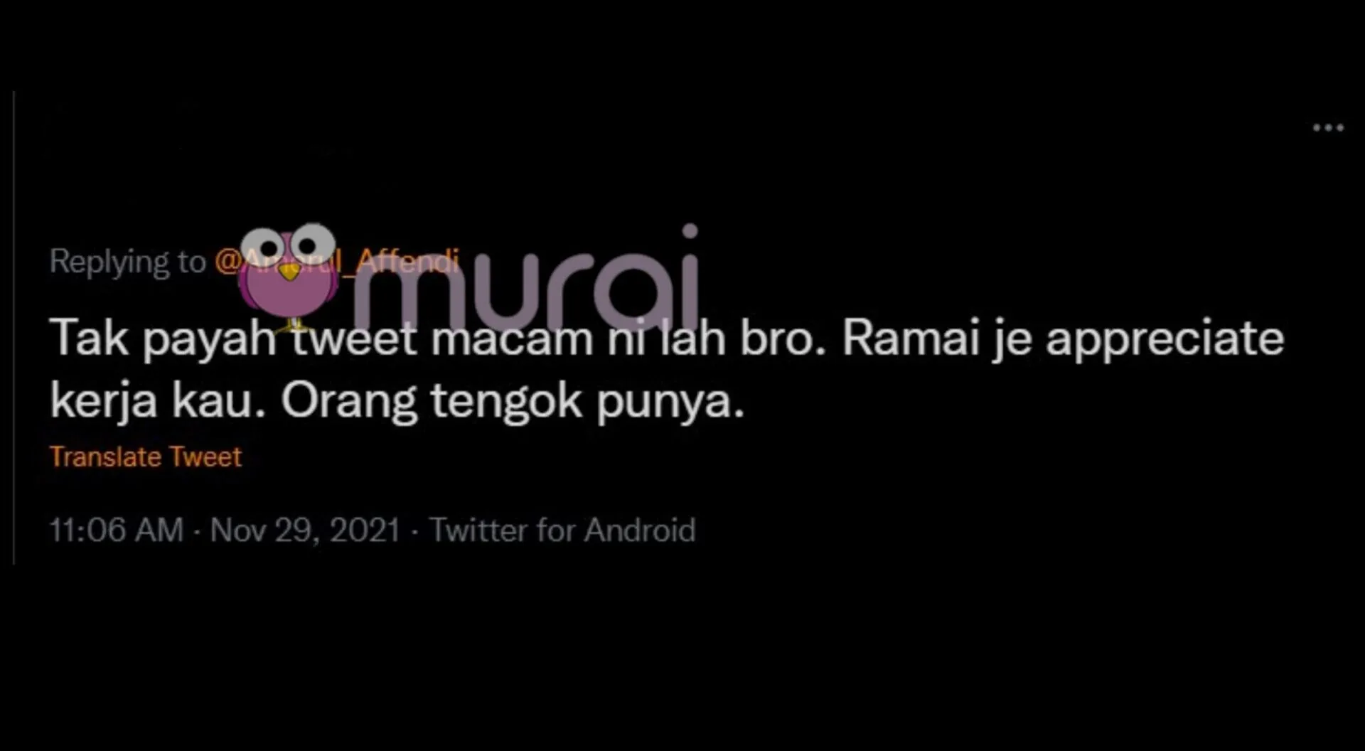 “Tak payah tweet macam ni lah bro. Ramai je appreciate kerja kau. Orang tengok punya”- ciap warganet tersebut