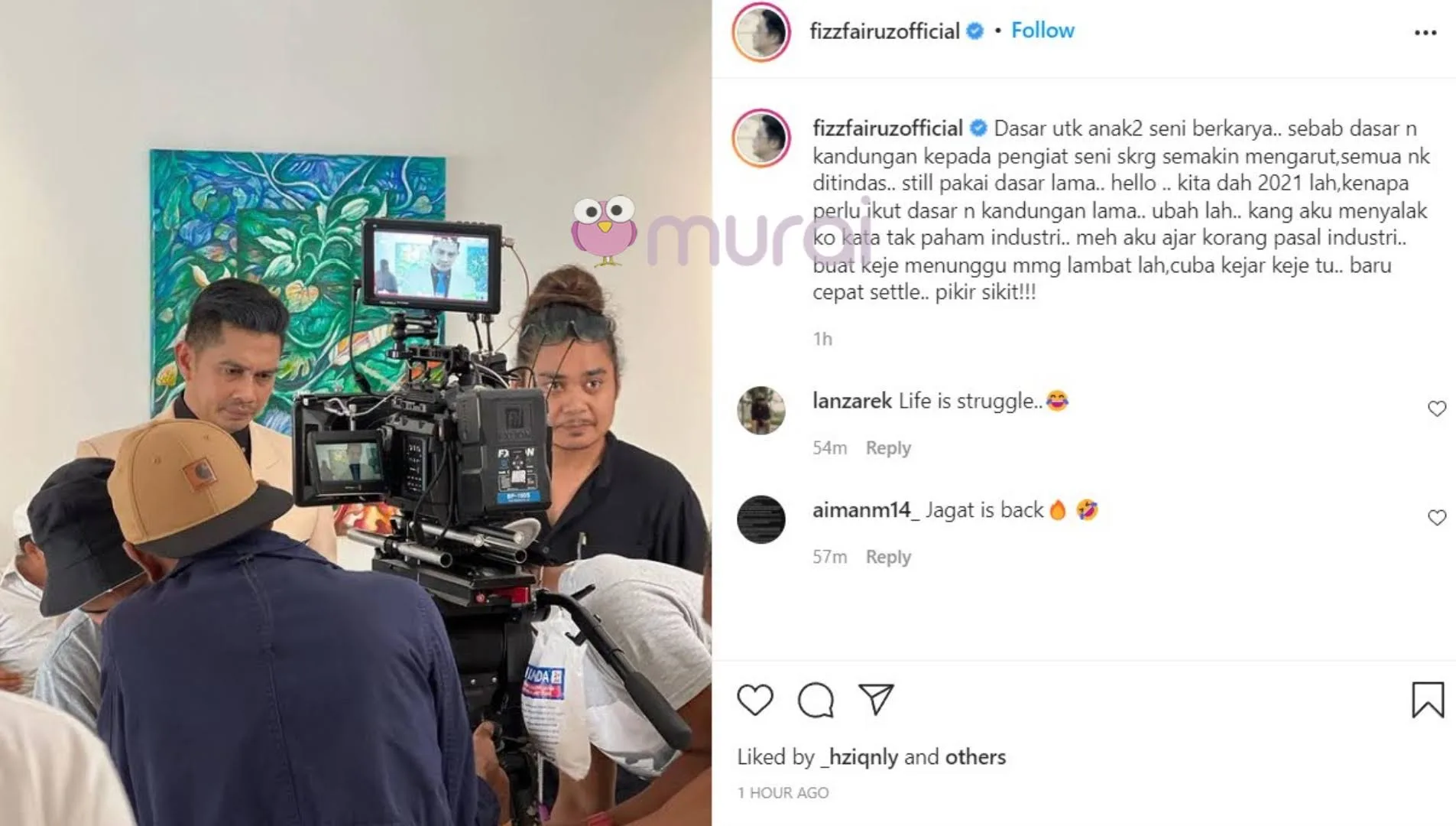 “Dasar untuk anak-anak seni berkarya..Sebab dasar dan kandungan kepada penggiat seni sekarang semakin mengarut..Semua nak ditindas. Still pakai dasar lama”- tulis Fizz