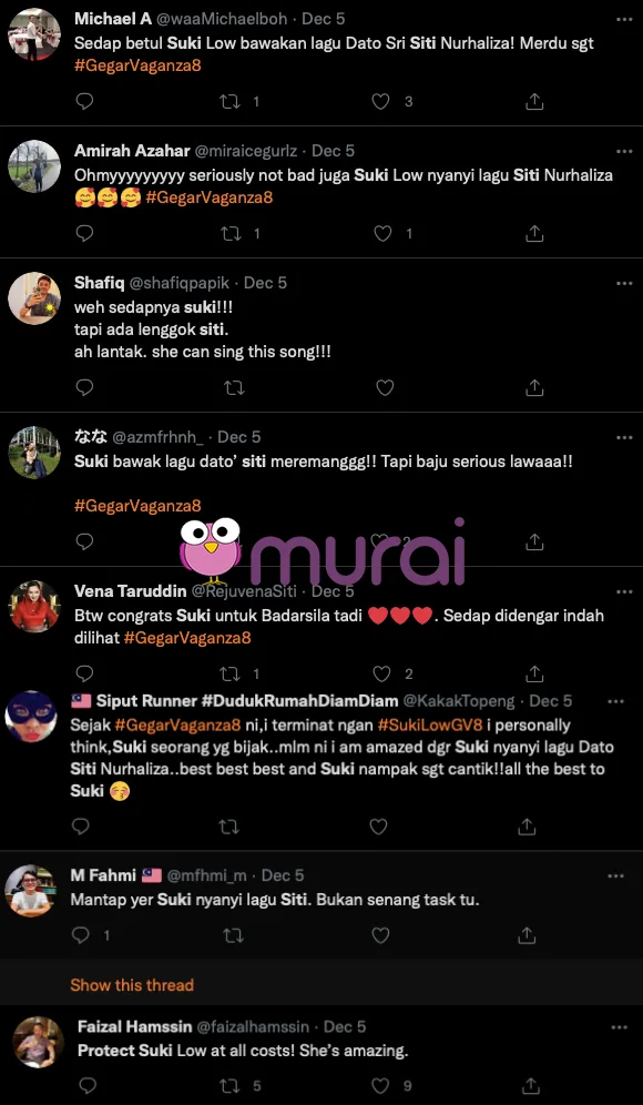 Di kesempatan itu, Suki ketika ditemui Murai.my usai daripada persembahannya berterima kasih kepada semua peminat terutama peminat Siti yang memuji persembahannya. Menurut Suki, dia telah mencuba sehabis baik untuk membawakan lagu tersebut dan berharap persembahannya tidak mengecewakan orang ramai.