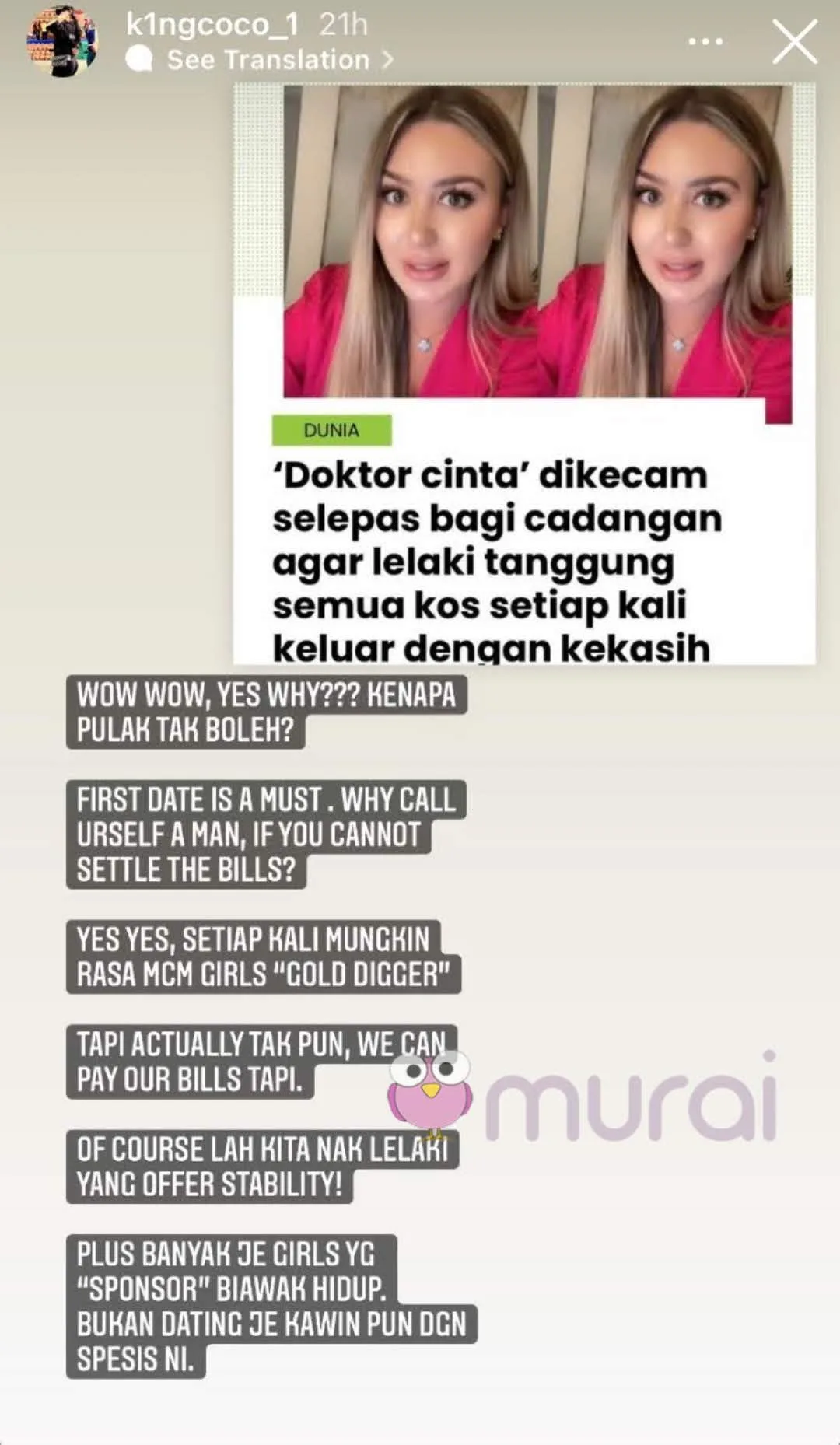 Selebriti media sosial , King Coco tampil mempertahankan  individu yang digelar doktor cinta berikutan mendapat kecaman selepas memberikan cadangan agar lelaki harus menanggung kos janji temu dengan kekasih.
