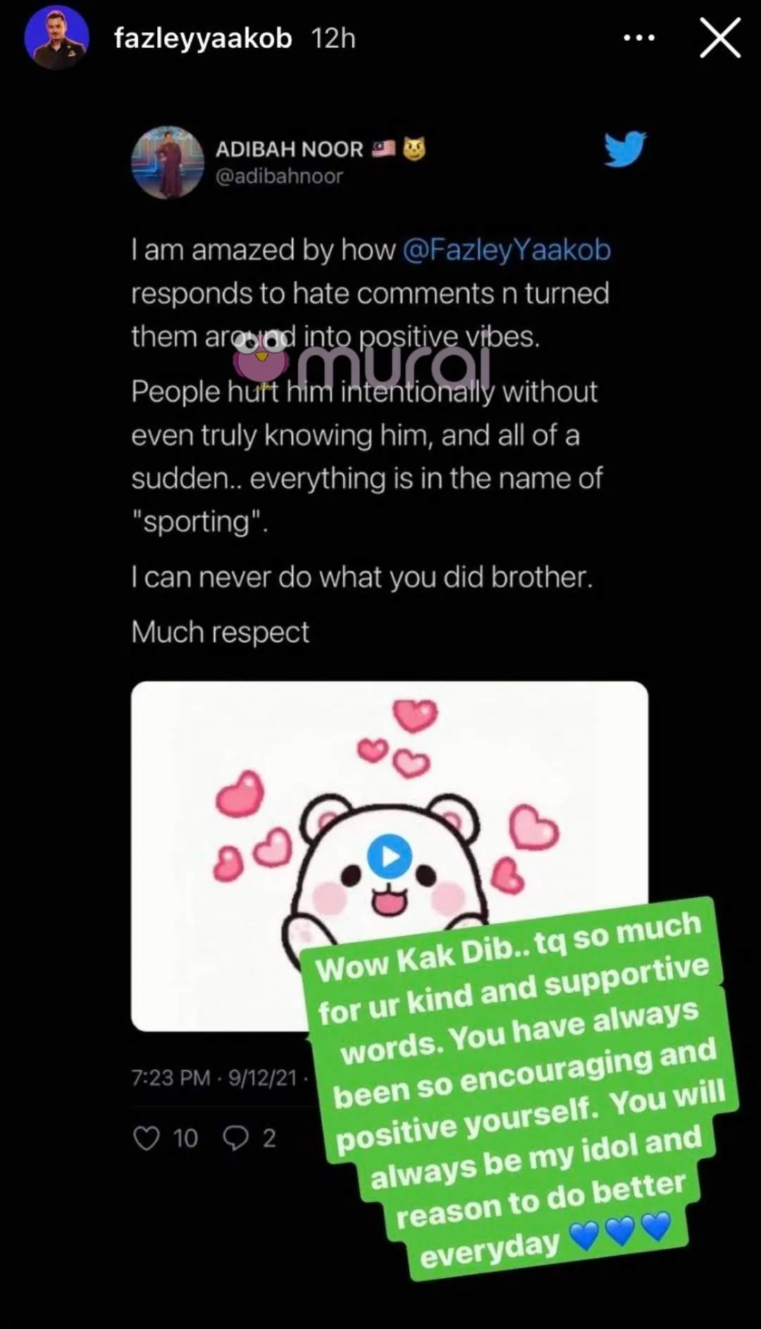 “Saya kagum dengan caranya @FazleyYaakob membalas komen kebencian dan mengubahnya menjadi aura positif.”-Adibah Noor