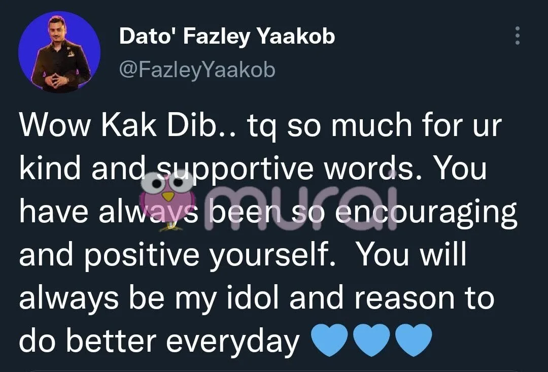 “Wow, Kak Dib..terima kasih banyak di atas kata-kata yang baik dan sokongan. Anda sentiasa menggalak dan positifkan diri anda. Anda akan sentiasa menjadi idola saya dan alasan untuk melakukan dengan lebih baik setiap hari”-Dato’ Fazley Yaakob