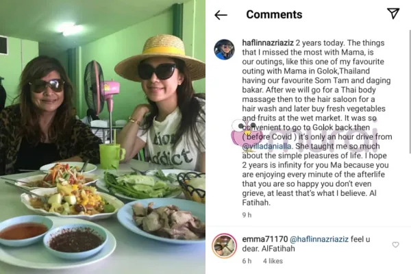 Isteri kepada ahli politik Datuk Seri Nazri ini, berkongsi gambar kenangan keluar bersama arwah ibunya di Golok, Thailand pada dua tahun lalu. Menurut Haflin, mereka berdua gemar ke sana bagi menikmati makanan kegemaran iaitu Som Tam dan daging bakar.