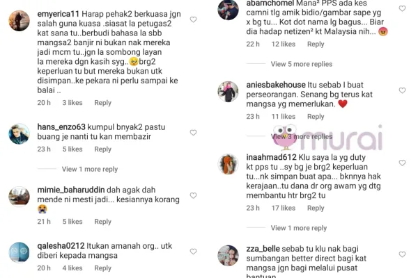 Melihat perkongsian di Instagram pelakon veteran ini, orang ramai membanjiri ruangan komen posting tersebut dan rata-rata ramai yang memberi kritikan terhadap petugas pusat penempatan sementara (PPS) yang tidak amanah menjalankan tugas.