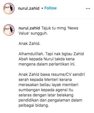 “Alhamdulillah. Tapi nak bgtau Zahid Abah kepada Nurul takda kena mengena dalam perlantikan ini.”