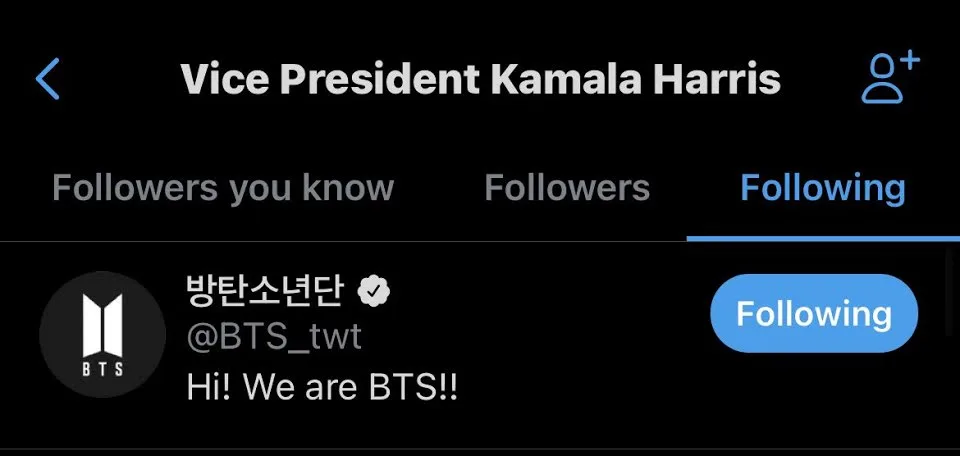 Bukan itu sahaja, Naib Presiden Amerika ke-49, Kamala Harris bukan sahaja mengikuti akaun rasmi BTS, beliau turut sertakan muzik hit BTS iaitu Boy With Luv dalam playlist Spotify beliau.