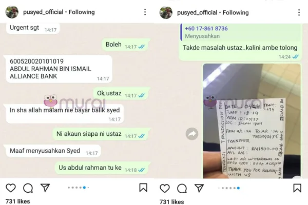 “Tak ada masalah ustaz.. Kali ni ambe tolong. (Gambar resit tulisan tangan)” Mesej PU Syed.