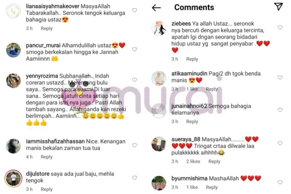 Melihat video percutian keluarga dan membaca luahan cinta pendakwah ini di Instagram, membuatkan orang ramai berkongsi pelbagai komen menarik serta mencuit hati di ruangan komen posting tersebut.