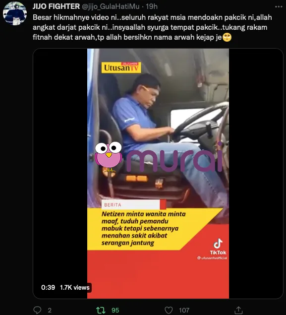 Dalam video itu, wanita tersebut mendakwa lelaki itu telah mabuk dan menjadi punca lori terbabit kemalangan. Sebaliknya, perkara yang menyayatkan hati telah berlaku apabila lelaki itu sebenarnya mengalami serangan jantung dan disahkan meninggal dunia ketika menerima rawatan di hospital.