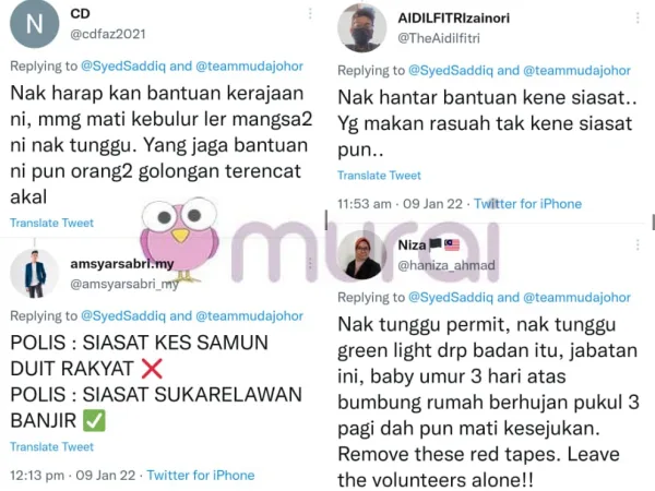 “Nak tunggu permit, nak tunggu green light dari badan itu, jabatan ini, baby umur 3 hari atas bumbung rumah berhujan pukul 3 pagi dah pun mati kesejukan. Remove these red tapes. Leave the volunteers alone!!” komen mereka