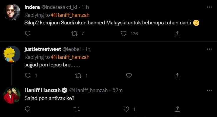Menerusi laman Twitter, Haniff tidak menolak Malaysia bakal mendapat masalah sekiranya kerajaan Arab Saudi mengambil tindakan berhubung isu jemaah tidak divaksin dibenarkan untuk menunaikan Umrah.