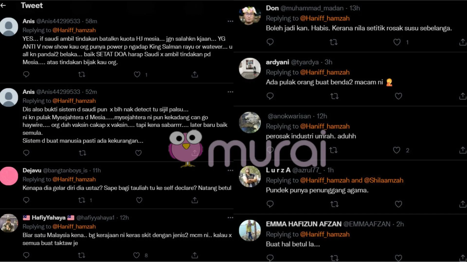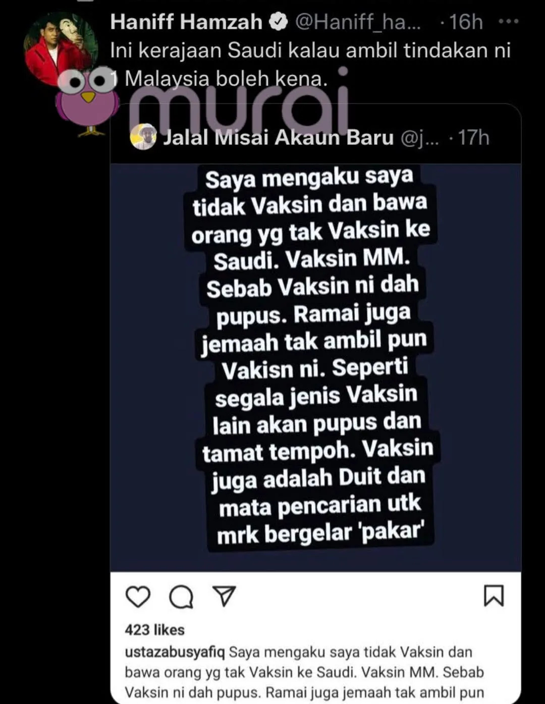 Pendedahan mengejutkan oleh pendakwah bebas, Ustaz Abu Syafiq yang mengaku dirinya adalah individu yang tidak divaksin dan membawa jemaah yang tidak divaksin ke Tanah Suci ,mendapat reaksi dari perlbagai pihak termasuklah pengacara dan penyampai radio terkenal, Haniff Hamzah.