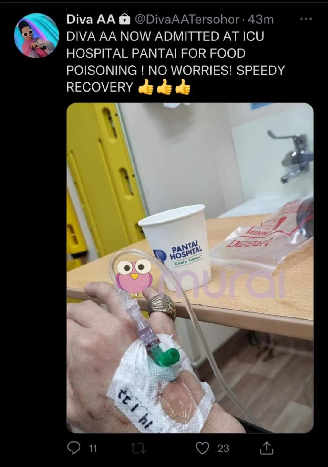 “Bercakap pasal ICU, saya hanya berkongsi foto tangan saya menerima drip air selain memaklumkan saya keracunan makanan dan tulis kapsyen jangan risau. Tak ada apa-apa pun sebab saya masuk pukul 5.30 pagi dan pukul 7.50 pagi saya cakap dekat doktor saya nak keluar hospital. Doktor pun terkejut dan dia cakap tak boleh sebab saya harus ditempatkan di wad untuk rawatan lanjut. Tetapi saya cakap dekat dia kembali tak boleh sebab saya ada program di Johor Bahru” kata Diva AA kepada Murai.my