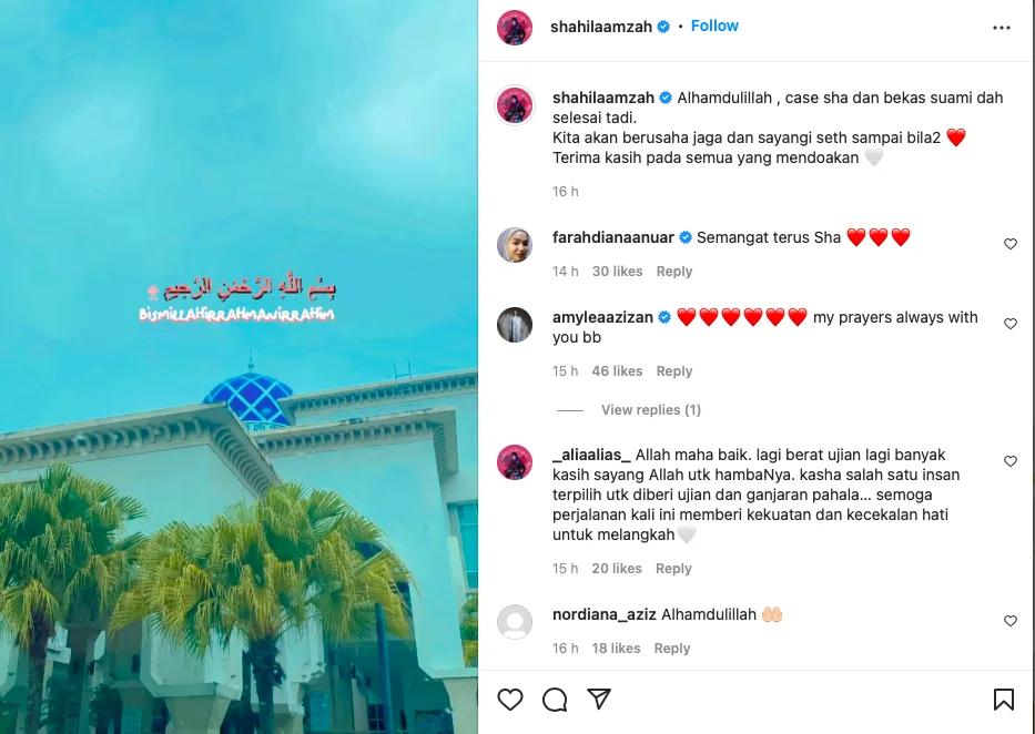 “Alhamdulillah, case Sha dan bekas suami dah selesai tadi. Kita akan berusaha jaga dan sayangi Seth sampai bila-bila. Terima kasih pada semua yang mendoakan,” tulis Shila