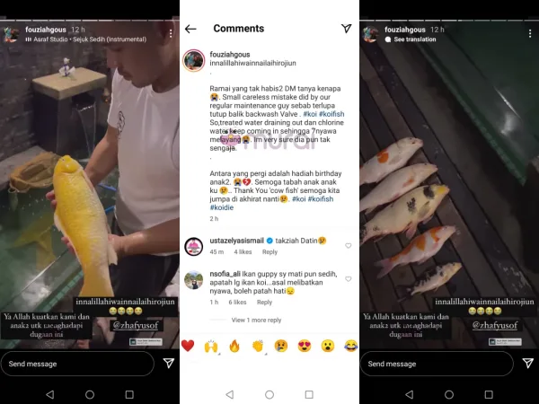 Dalam muat naik tersebut,Fouziah dengan rasa sedih menjelaskan ketujuh-tujuh ikan koi kesayangannya telah mati dan antara ikan tersebut merupakan hadiah hari lahir untuk anak-anaknya.
