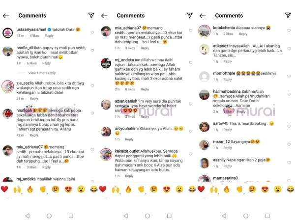 “Memang sedih.. Pernah melaluinya… 13 ekor koi saya mati mengejut.. Tak pasti punca.. Tiba-tiba terapung.. Jadi saya rasa apa anda rasa..”