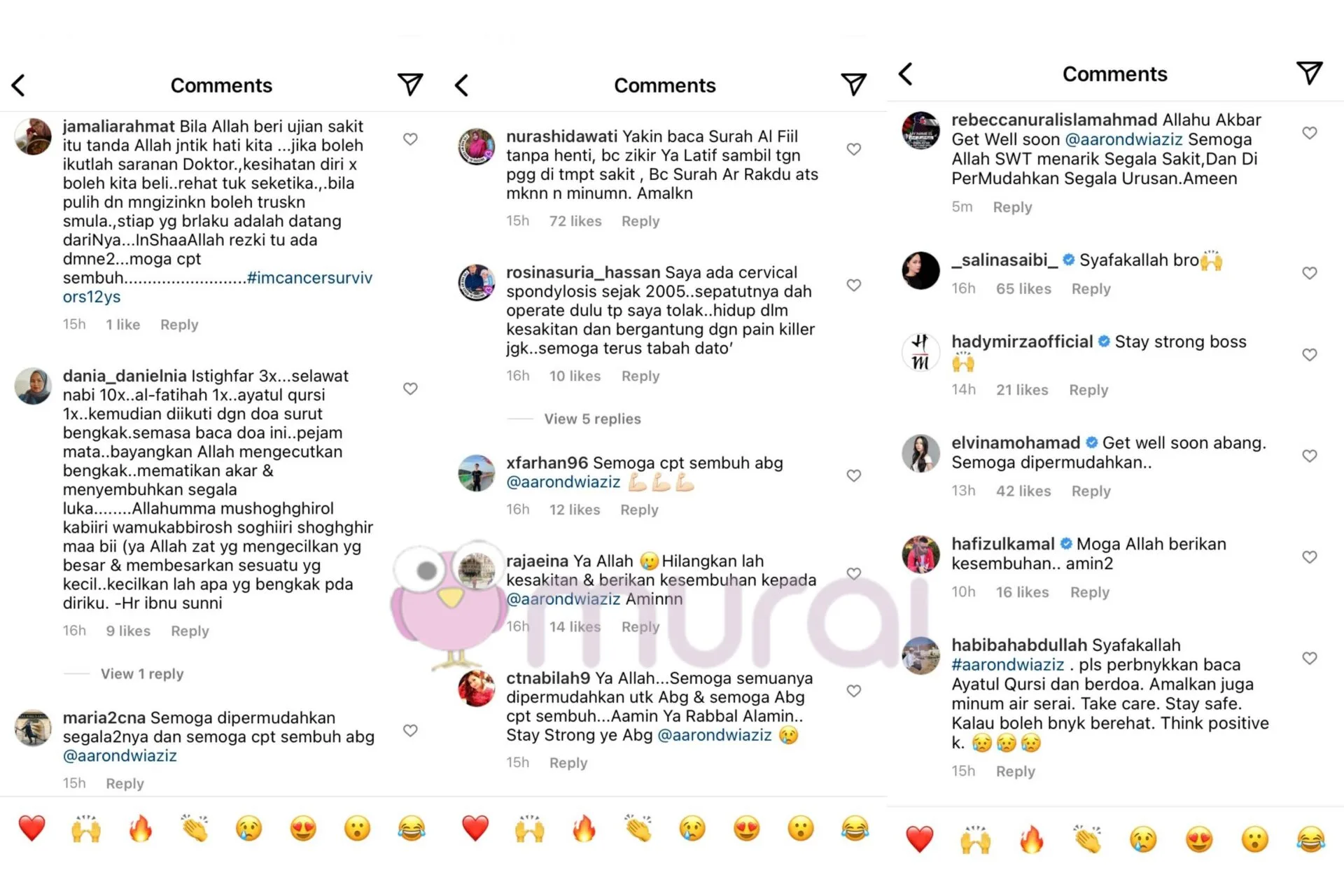 Ruangan komen di posting yang dimuatnaik oleh Aaron itu turut disusuli dengan komen rakan selebriti dan peminat yang mendoakan agar aktor ini diberikan kesembuhan dengan segera.