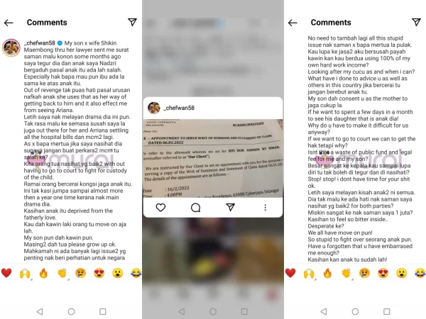 Sebelum ini, cef tersohor negara ini pernah menasihati bekas menantu dan anak lelakinya Mohd Nadzri yang membabitkan isu cucu perempuannya Putri Arianna Natasya.