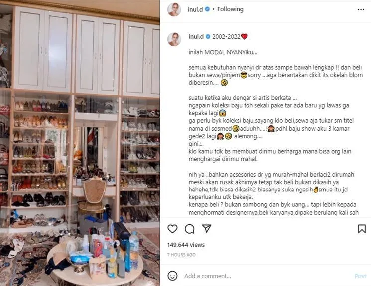 Inul Daratista yang menulis kapsyen panjang pemngenai koleksi barang peribadinya. Selebriti cantik ini menjelaskan bahawa semua barangan tersebut telah dikumpul dari tahun 2002 sehingga kini.