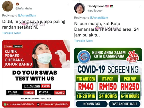 Lantaran itu, ramai yang berkongsi klinik yang menawarkan perkhimatan ujian RTK dan PCR di media sosial dengan harga yang berpatutan dan berbaloi untuk dilawati.