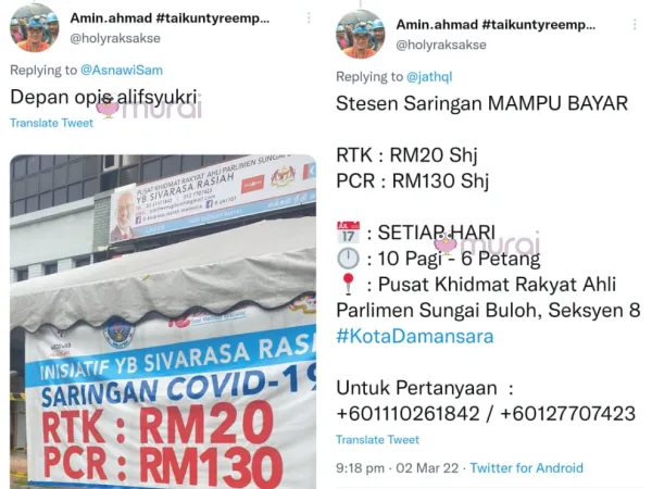 Selain itu, ada juga pengguna Twitter yang lain berkongsi maklumat terdapat stesen saringan di hadapan pejabat usahawan terkenal Aliff Syukri juga menawarkan harga ujian RTK dan PCR yang murah.