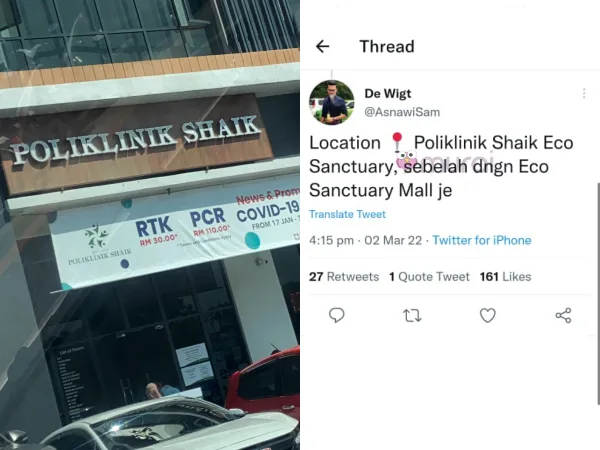 Pemilik akaun Twitter De Wigt memuatnaik ciapan, memberitahu bahawa Poliklinik Shaik yang terletak di Eco Santuary menawarkan harga ujian Covid RTK sebanyak RM30 dan PCR RM110 sahaja.